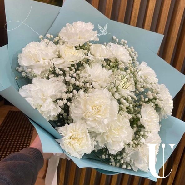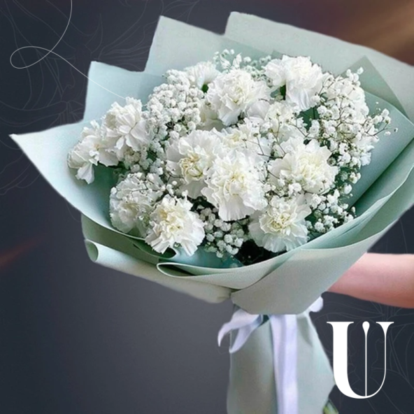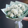 Сборный букет "Гелена" в корейской матовой пленке с атласной лентой - это стильный и изысканный подарок, который подойдет для любого повода. В составе букета 15 белых гвоздик и гипсофила, в сочетании они создают гармоничную и насыщенную композицию. Этот элегантный и нежный букет станет отличным подарком для любого повода.